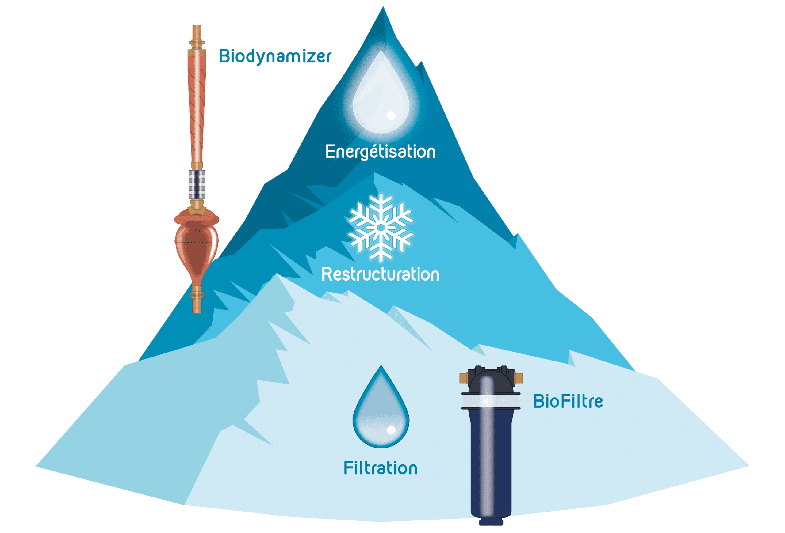 Grâce à ce procédé 100% naturel qui applique les principes du biomimétisme (observer, comprendre et copier la nature afin de retrouver la vraie nature de l’eau), l’eau biodynamisée par le Biodynamizer (qui intègre 21 principes de dynamisation en tout !), possède des qualités comparables à celles de l’eau de montagne.