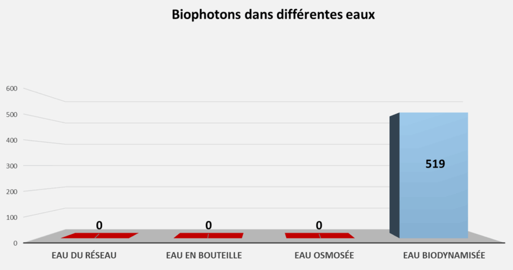 1) L’eau du réseau (216 ppm) biodynamisée émet beaucoup de bioluminescence sous forme de biophotons (519 RLU/seconde/cm2) ce qui n’est absolument pas le cas des autres eaux mesurées (0 RLU pour les eaux de réseau, bouteille minérale, osmosée)