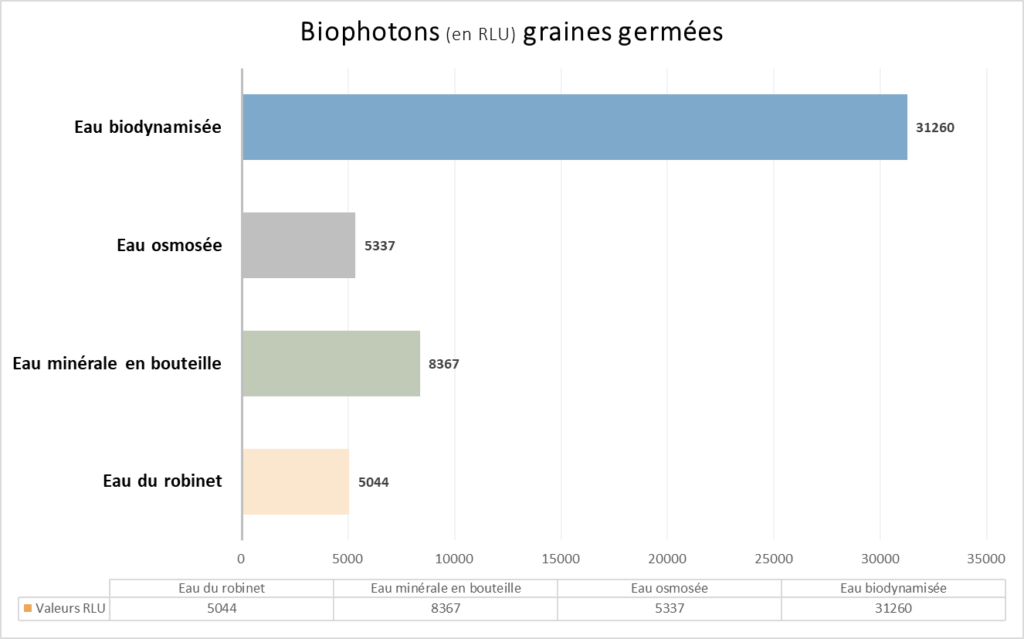Il y a une corrélation entre le niveau d’énergie (biophotons) constaté dans l’eau biodynamisée et celle observée dans les graines germées: les graines germées arrosées avec de l’eau biodynamisée émettent 6 fois plus de biophotons (31.226 RLU/seconde/cm2) que celles arrosées avec les autres eaux mesurées. Celles-ci émettent de 73% à 84% de biophotons en moins ! Cela démontre que la qualité énergétique de l’eau biodynamisée est transférée au vivant. Cela suggère aussi que le rayonnement biophotonique provenant de l’activité biochimique propre à la graine est complété par l’émission biophotonique de l’eau biodynamisée qui l’amplifie. Ceci permet un niveau plus élevé de vitalité fonctionnelle du processus biologique de la plante.