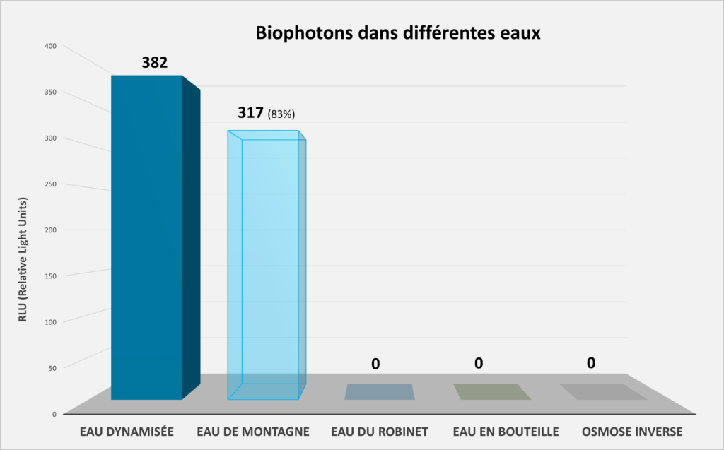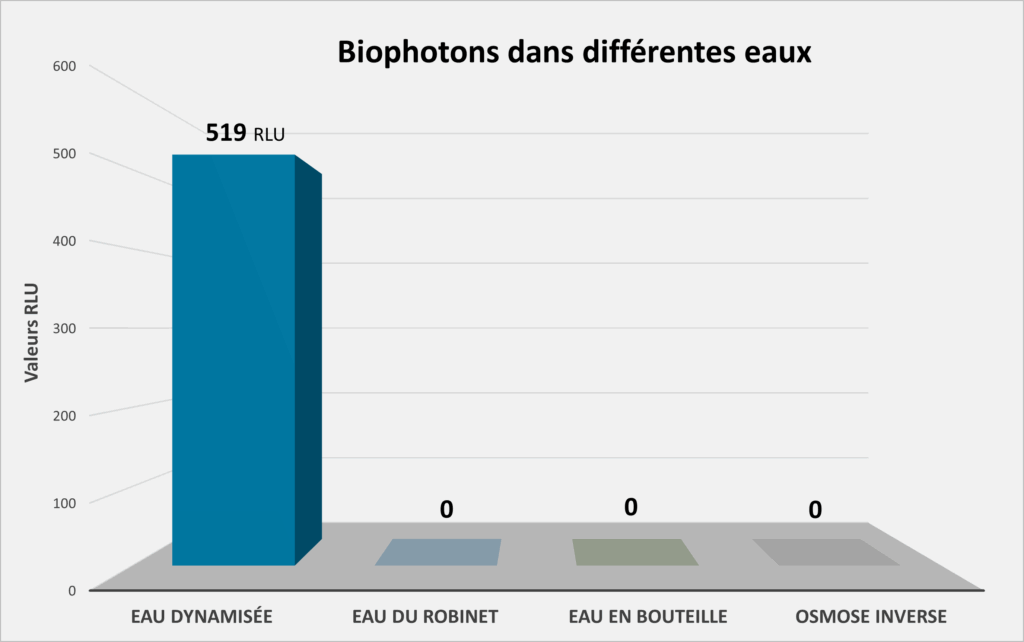 Ces biophotons représentent alors un indice de qualité énergétique et biologique de l’eau. Ils ne reflètent donc pas une activité biochimique, mais plutôt une quantité et un état d’organisation électrodynamique qui permet une capacité de transfert d’énergie améliorée et d’information cohérente propice à la vie (vitalité de l’énergie).