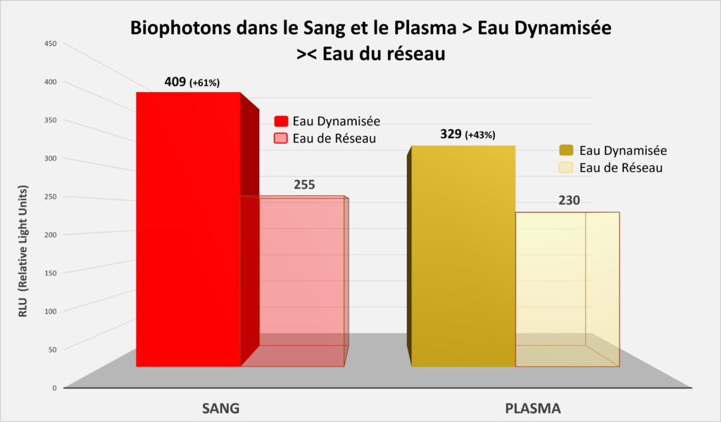 - Résultats: Le plasma des personnes ayant bu de l’eau Biodynamisée présente + 43% de bioluminescence plasmatique