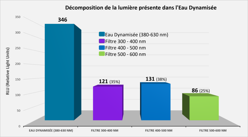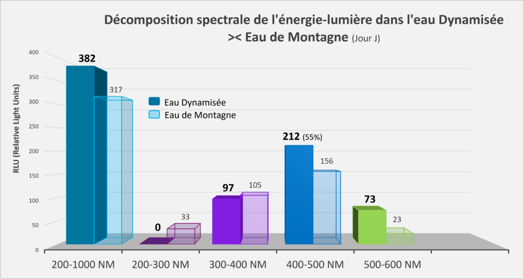 - 300-400 nm: 33% d’émission >< 25% pour l’eau dynamisée