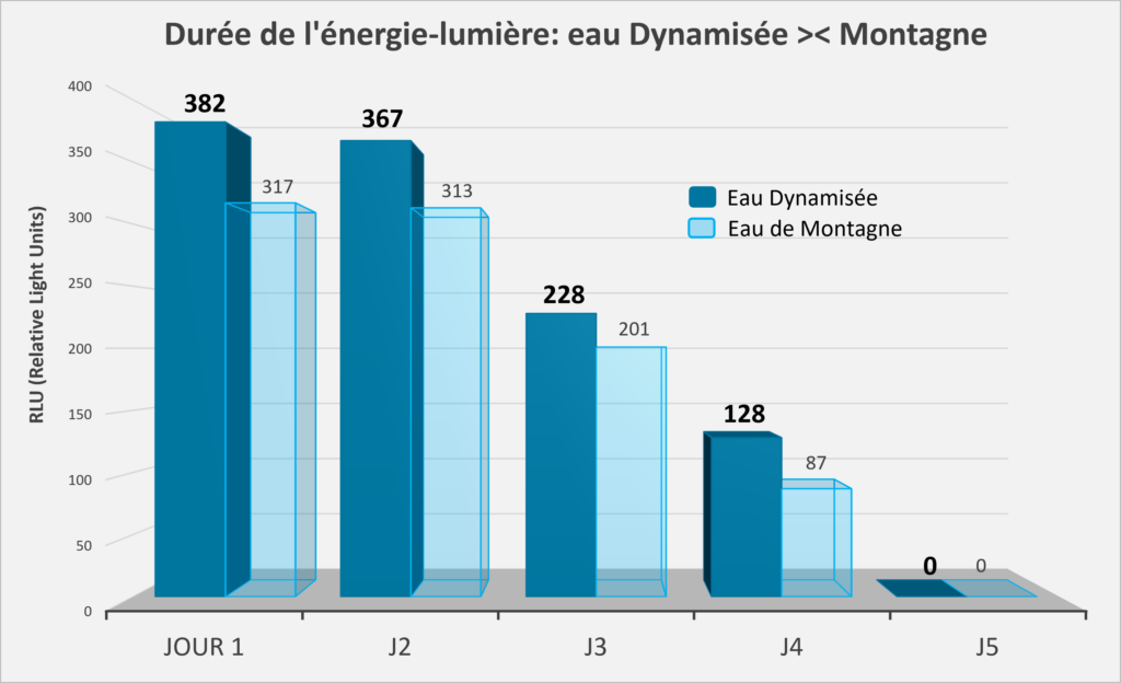 - 200-300 nm: 33 RLU >< 0 RLU pour l’eau dynamisée