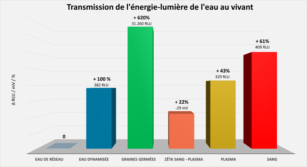 - Le sang total des personnes ayant bu de l’eau Biodynamisée présente + 61% de bioluminescence en plus par rapport au sang après avoir bu de l’eau de réseau