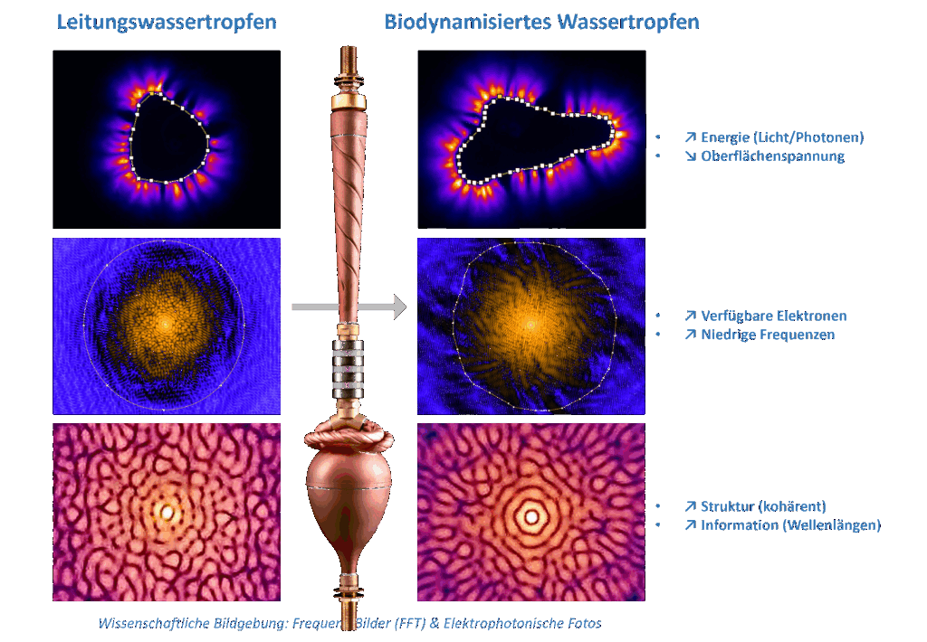 Dies bestätigt die Ergebnisse der Elektrophotonischen Analyse und bestätigt die Vorteile der Wasserbiodynamisierung mit dem Biodynamizer in Bezug auf: