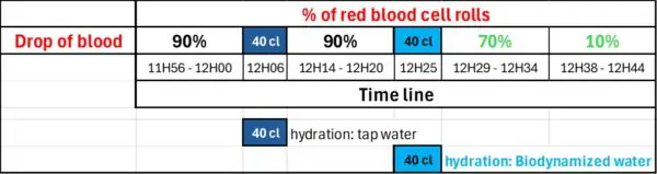 The analysis by Dr. Seelentag’s IPR (Institut de Pathologie Romand) laboratory in Lonay, Switzerland, carried out on September 10, 2025, confirms the unstacking of red blood cell rolls that are released after hydration with Biodynamized water (90% -> 10% in 13 minutes!), which is absolutely not the case after hydration with tap water!