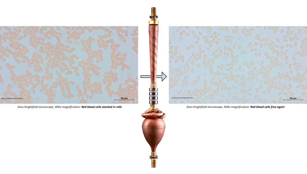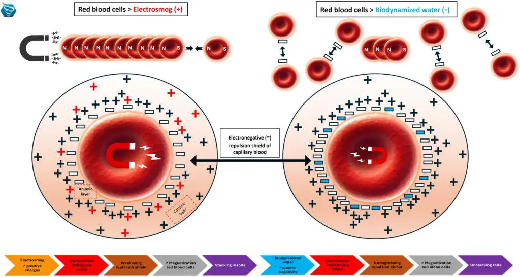 - After drinking 1 glass of biodynamized water, the red blood cells detach within minutes (only about 10% of the red blood cells accumulated in rolls remain) and become free again!