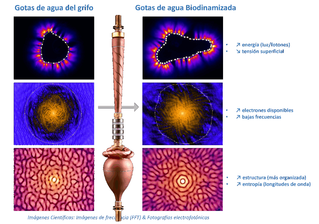 - El agua dinamizada está más estructurada y organizada (la entropía aumentó en un +20%).