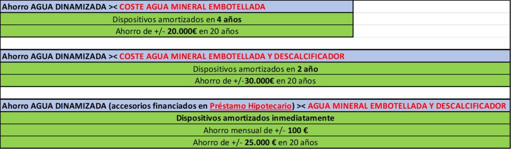 - Se hacen ahorros significativos en la compra de agua embotellada. De hecho, el agua del grifo (que será filtrada y dinamizada) cuesta 150 veces menos (~ 0,004 euros/litro) que el agua mineral embotellada (~ 0,60 euros/litro)! Con este argumento, al sustituir los frascos por el paquete Biofilter + Biodynamizer, una familia de 5 personas ahorrará más de 1.000 euros al año). Estos dispositivos son por lo tanto reembolsados en menos de 4 años!