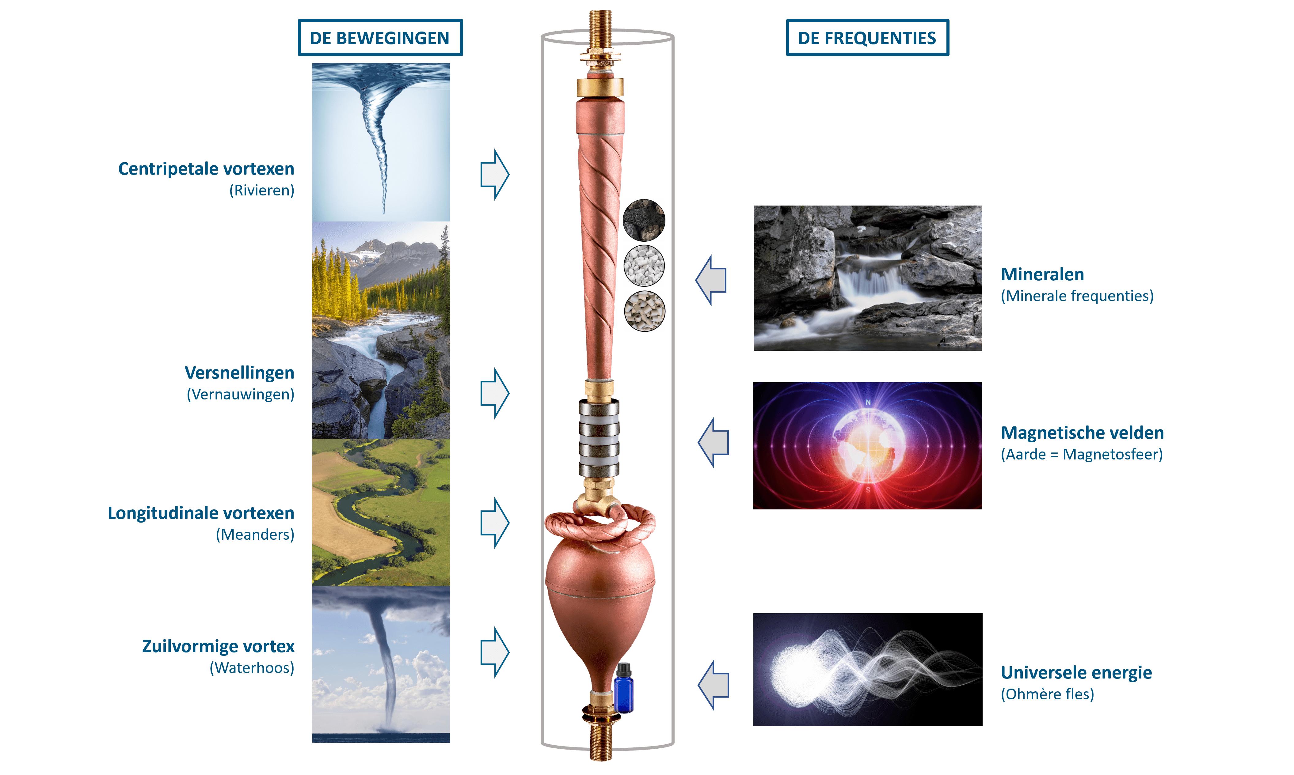 De natuurlijke waterstroom die wordt gereproduceerd door de vormen van Biodynamizer ontleent de volgende  bewegingen aan de natuur :
