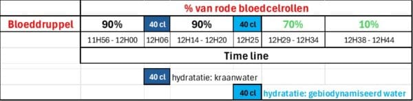 - Vóór het drinken van gebiodynamiseerd water, zijn +/- 90% van de rode bloedcellen opgestapeld in de vorm van rolletjes.