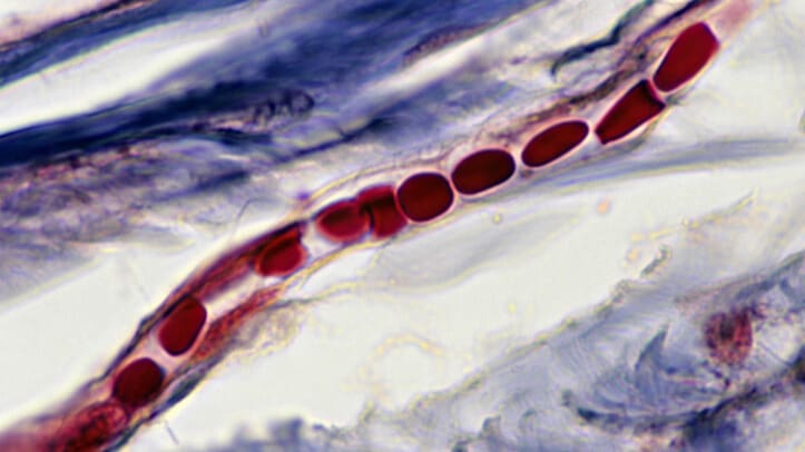 Zeiss helderveldmicroscoop, 400x vergroting: Rode bloedcellen opgestapeld in rollen