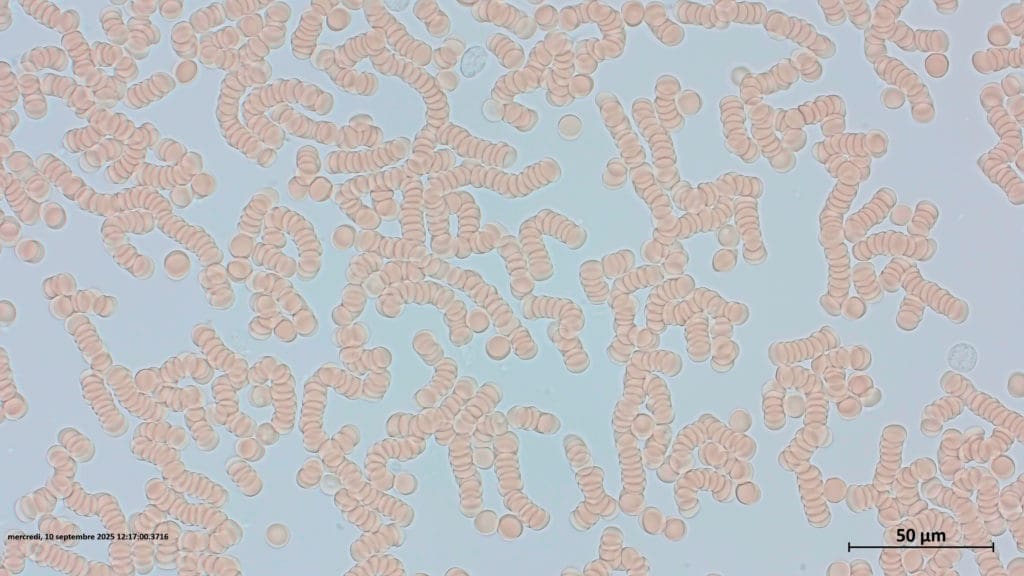 De analyse van het laboratorium van Dr. Seelentag’s IPR (Institut de Pathologie Romand) in Lonay, Zwitserland, uitgevoerd op 10 september 2025, bevestigt de ontstapeling van rode bloedcelrollen die vrijkomen na hydratatie met gebiodynamiseerd water (90% -> 10% in 13 minuten!), wat absoluut niet het geval is na hydratatie met kraanwater!