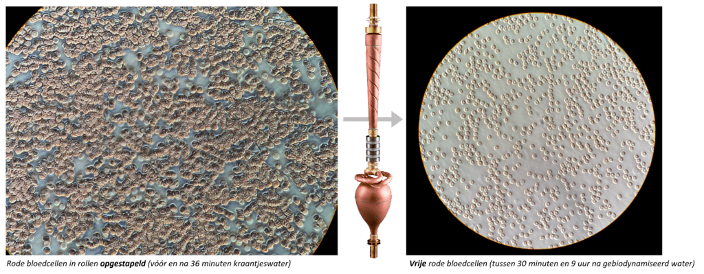 - Na het drinken van 1 glas gebiodynamiseerd water is er een ontbinding van de rode bloedcellen binnen enkele minuten (slechts +/- 10% van de rode bloedcellen behouden de vorm van rolletjes) die opnieuw vrij zijn !