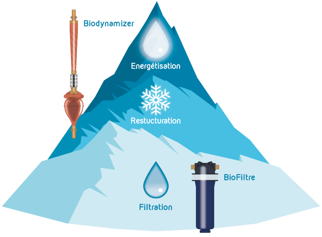 Pour bénéficier d’une eau vive telle qu’on la retrouve dans la nature, il convient de la filtrer (Biofiltre), ensuite de la restructurer (Biodynamizer), et enfin de l’énergétiser (Biodynamizer).